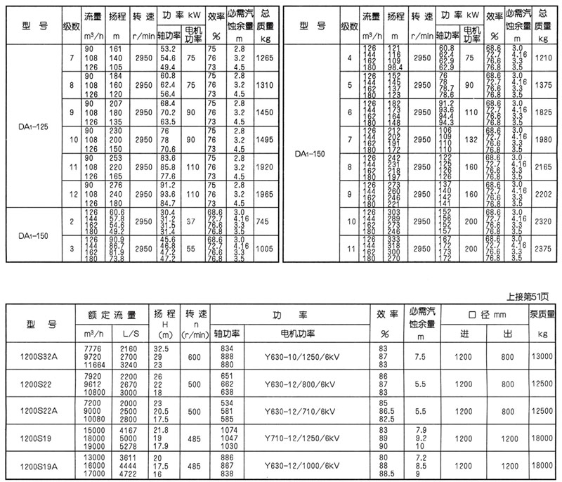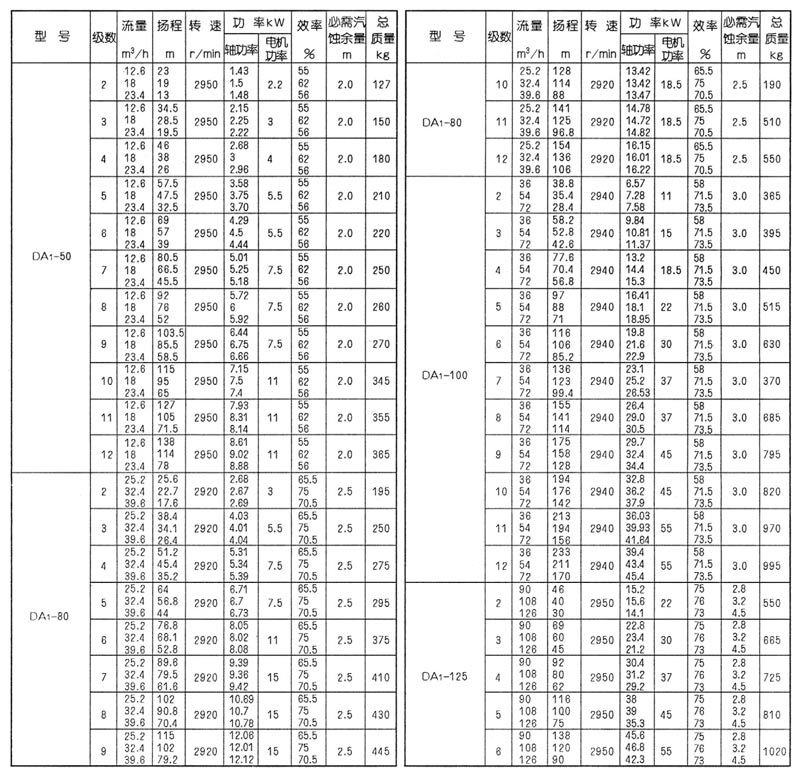 型號(hào)意義:如DA1-100X5。100-泵進(jìn)、出口直徑(mm),5-泵的級(jí)數(shù)。
