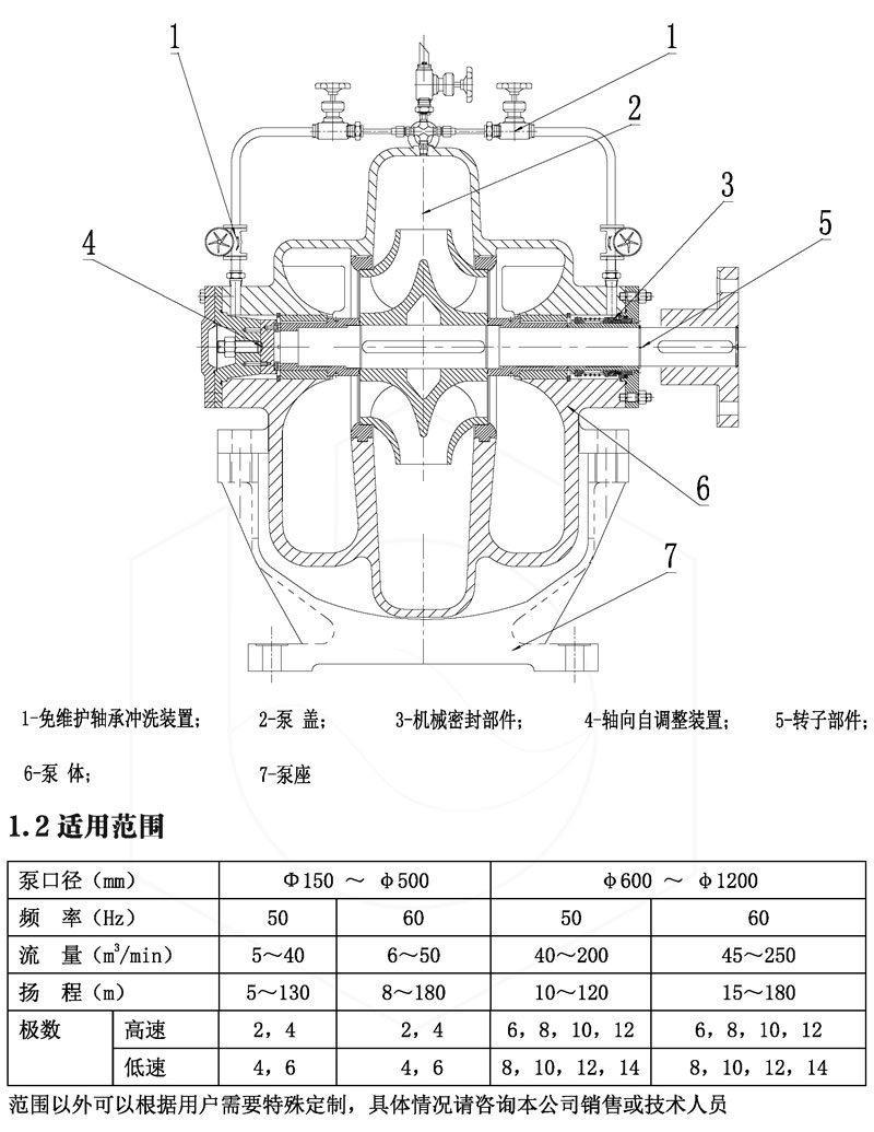 ES 型雙吸泵的軸承為位于泵體內(nèi)部的自潤(rùn)滑軸承來支撐轉(zhuǎn)子部件,其較大優(yōu)點(diǎn)是免維護(hù)(即無需日常維護(hù)保養(yǎng)),并具有安裝空間小、運(yùn)行平穩(wěn)、效率高,運(yùn)行及檢修費(fèi)用更低。