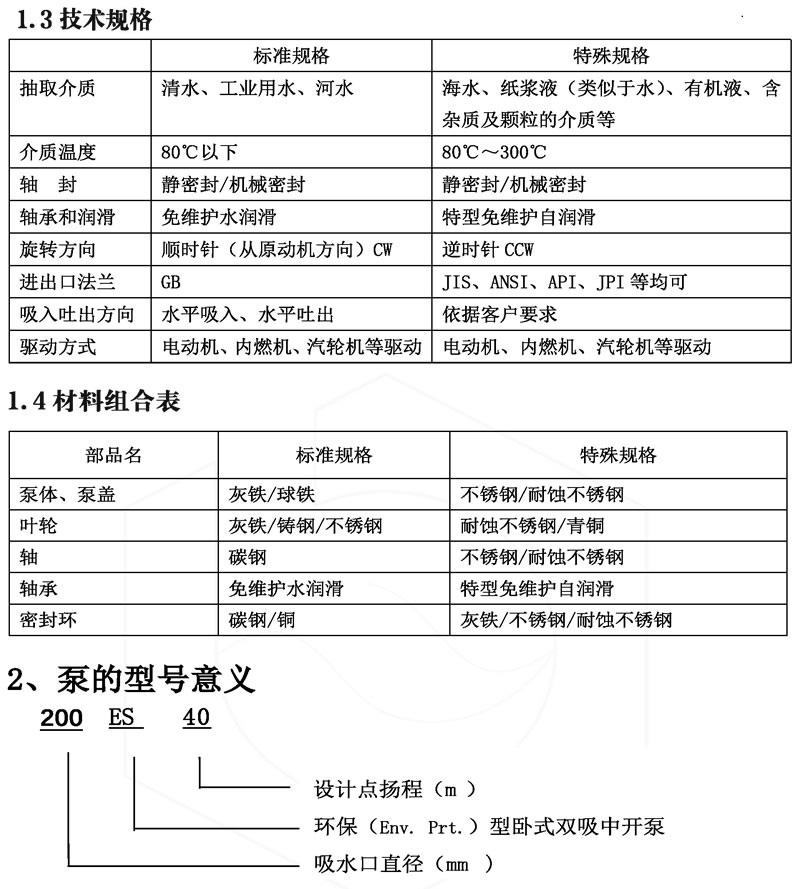 ES 系列環(huán)保免維護(hù)單級(jí)雙吸中開臥式和立式離心泵,是我公司在總結(jié)多年雙吸泵制造及應(yīng)用經(jīng)驗(yàn)的基礎(chǔ)上,結(jié)合用戶在用泵過程中的痛點(diǎn),由公司專家與國(guó)內(nèi)外專家共同創(chuàng)造發(fā)明的一種新型水泵(臥式泵專利號(hào):ZL 201822092944.2;立式泵專利號(hào):ZL 2019 2 0293130.7)。其主要特點(diǎn)是環(huán)保、免維護(hù)。